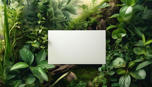 一张空白卡片放置在自然背景中,周围环绕着绿色植物和自然元素,展现出宁静与自然的结合。