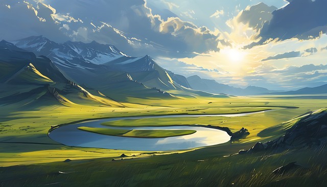 辽阔的草原与蜿蜒的山脉在阳光下交相辉映,展现出宁静自然的美丽景象。