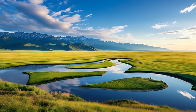 辽阔的草原与蜿蜒的山脉在阳光下交相辉映,展现出宁静自然的美丽景象。