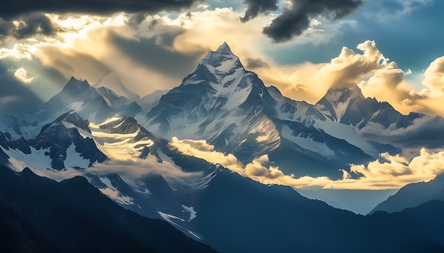 壮观的山脉在阳光和阴云交织的背景下展现出自然的雄伟,蕴含着大自然的力量与美丽。