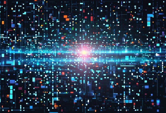 摘要数字技术未来背景。带有发光颗粒方形元素的方形像素图案。技术或科学研究演示背景。矢量插图。