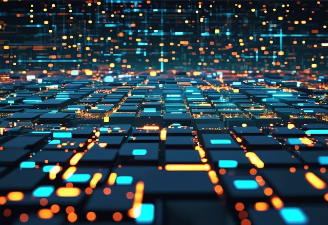 摘要数字技术未来背景。带有发光颗粒方形元素的方形像素图案。技术或科学研究演示背景。矢量插图。