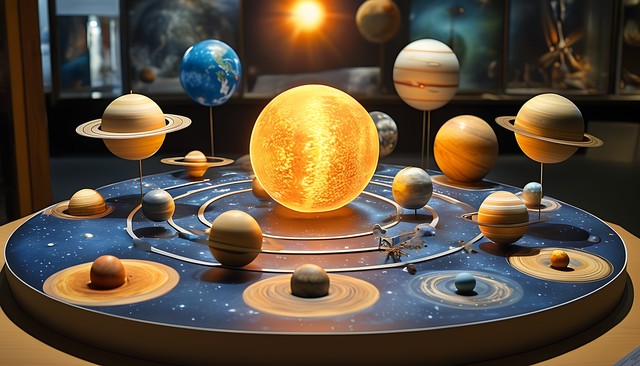 一幅展示太阳系模型的图画,中心的太阳周围环绕着各个行星,富有科学教育意义。