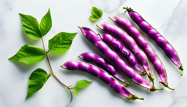 新鲜的紫色豆荚,排列整齐,背景为白色大理石,给人清新自然的感觉。