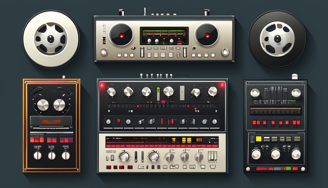 设置行倒带按钮、混音器控制器、音乐或视频设置和录像机编辑器图标。矢量