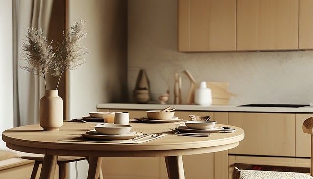 温馨的厨房场景,圆形木桌旁摆放着餐具,光线柔和,墙壁有简约装饰,与自然元素相结合。