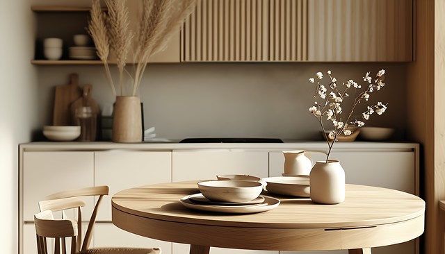 温馨的厨房场景,圆形木桌旁摆放着餐具,光线柔和,墙壁有简约装饰,与自然元素相结合。