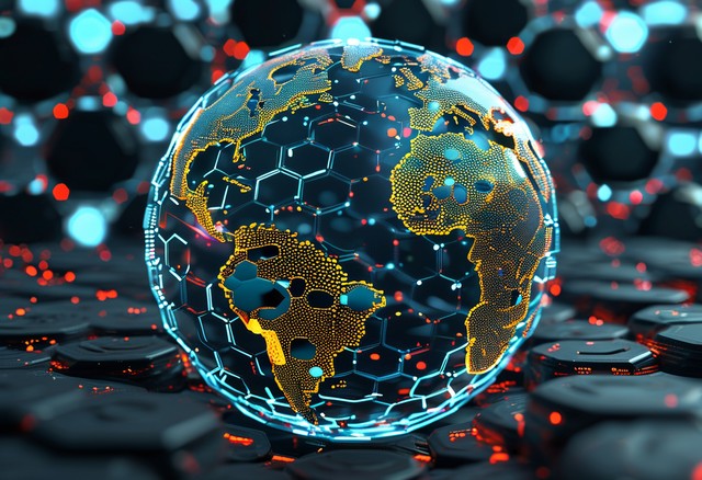 六边形网格组成的未来科技感的地球 代表高科技、大数据和物联网 点阵的球体和六边形网格地球