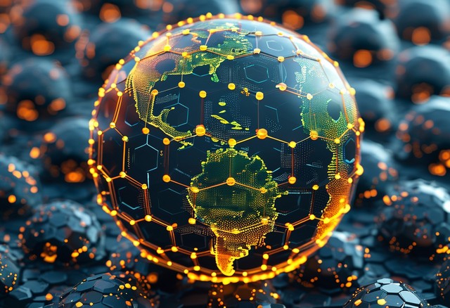 六边形网格组成的未来科技感的地球 代表高科技、大数据和物联网 点阵的球体和六边形网格地球