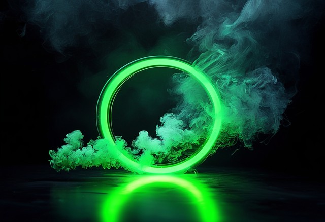 黑色背景上的绿色发光圆圈,带有光效和烟雾