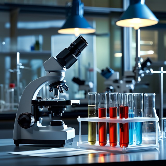 显微镜与试管的实验室场景,展示科研氛围。