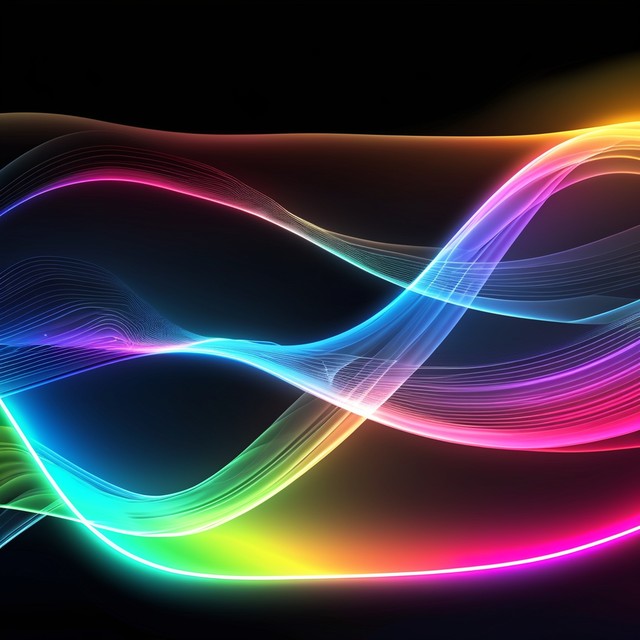黑色抽象背景,带有发光的彩虹波浪图案,流畅的曲线流动的动态渐变光。数字技术、通信、音乐均衡器概念的矢