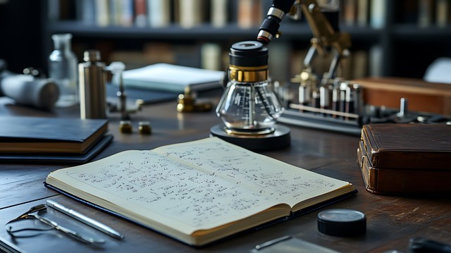 数字化测量仪器与传统笔记本并排,体现出科学研究的多样性。