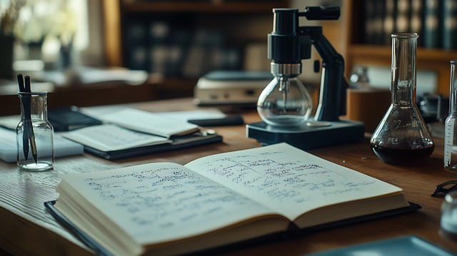 数字化测量仪器与传统笔记本并排,体现出科学研究的多样性。
