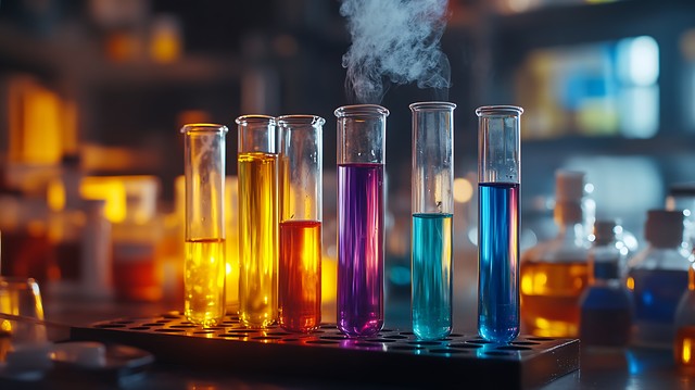 化学实验桌上,试管中彩色液体互相交融,形成充满惊喜的化学反应。