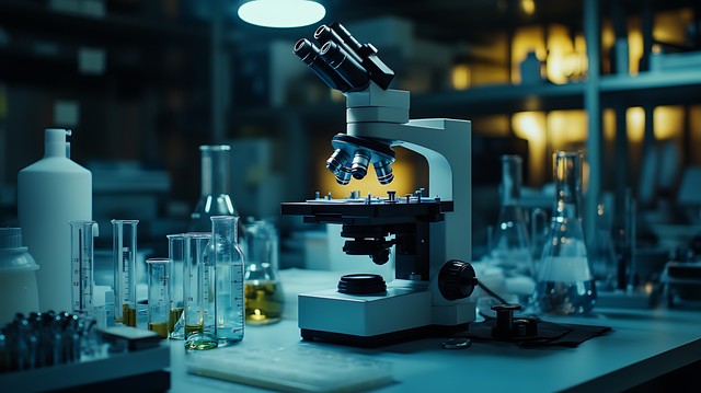 精密显微镜下观察生物细胞,背景是实验室中整齐排列的仪器。