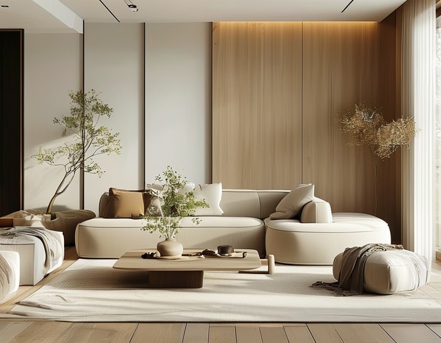 现代简约风格的客厅,温馨舒适,搭配自然元素与柔和色调。