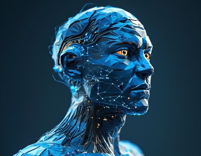 象征人工智能和神经网络技术的未来数字人脑插图。线条和点的低多边形设计。蓝色孤立背景。