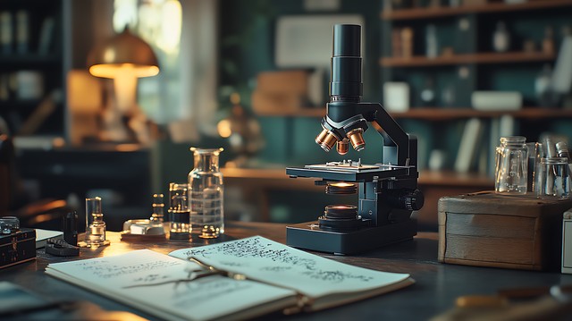 显微镜与笔记本并排摆放,记录下观察的细节,体现科研过程中的认真态度。
