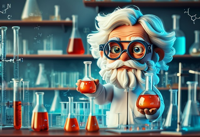 3D插画化学家科学家拿着试管和药片在实验室用设备进行实验,科学概念。