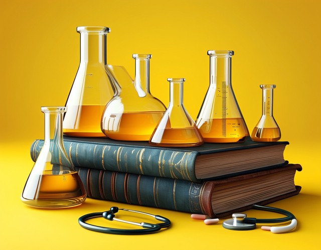3D插画烧瓶、书籍和医生在黄色背景上,文本空间
