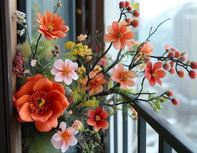 在阳台的一角,精致的手工花艺与自然元素融合,别具魅力。
