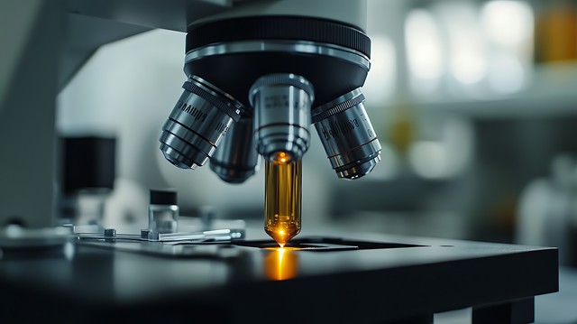 科学实验室中,研究人员在显微镜下观察合成橡胶的物理属性。