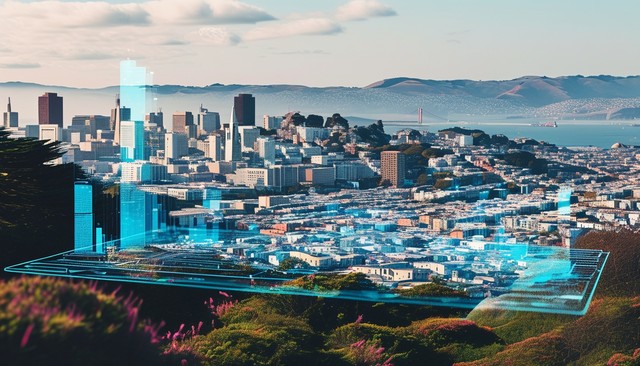 旧金山城市景观背景下的北美全息图数字地图,全球技术概念。多重曝光