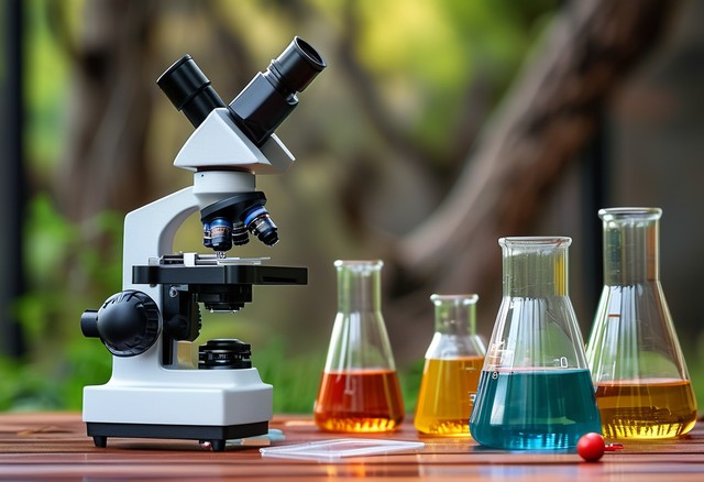 户外做科学实验的显微镜。概念,教育的科学工具,实验课。生物学学科。边做边学。做研究。科学项目工作。