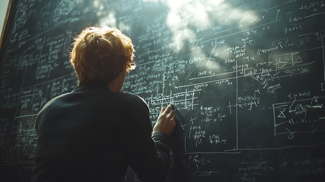 数学家在黑板上演算复杂的公式,表达理论研究的强烈思考。