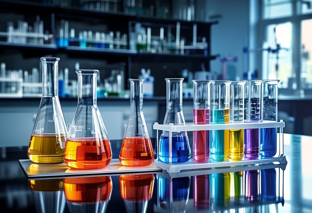 实验室内各种显色试剂反应的试管和烧杯,科学研究的氛围。