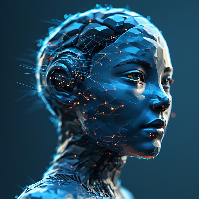 象征人工智能和神经网络技术的未来数字人脑插图。线条和点的低多边形设计。蓝色孤立背景。