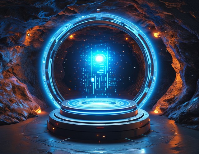 光全息图。魔法游戏门户。圆圈技术效果。数字未来平视显示器。科幻太空传送。发光的蓝色讲台。传送隧道。矢
