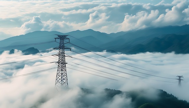 一座高压电塔矗立在云海之上,背景是绵延的山脉和霭霭云雾,展现出自然与人造建筑的结合