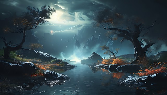 暗黑风格的奇幻场景,带有神秘的光源和自然元素,创造出一种独特的氛围,令人联想到梦境与幻觉。