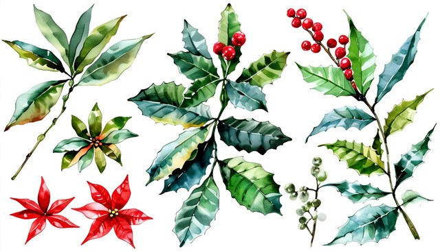 水彩圣诞植物。手绘植物元素孤立在白色背景。现代自然设计的分支。