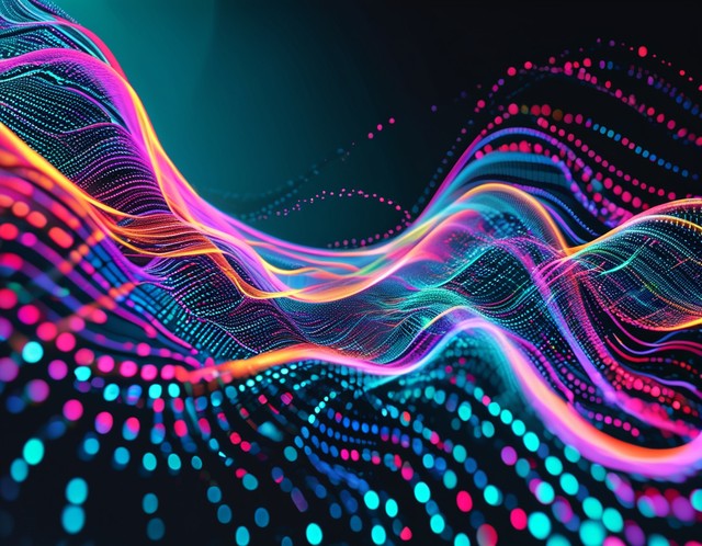 抽象半色调流动点波曲线,频率声音,技术曲线点线。数字未来技术概念,科学,横幅,模板,壁纸,商业,游戏