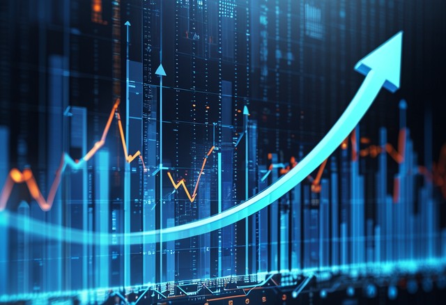 业务增长箭头上数字蓝色深色背景,投资图表技术成功电路,金融数据技术战略,市场图表利润货币,抽象金融背