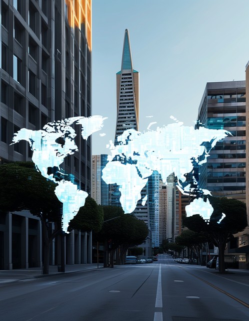 旧金山办公楼背景、大数据和数字技术概念上的图形美国地图全息图双重曝光