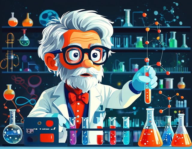 3D插画高级科学家教授在科学实验室进行实验。矢量图解