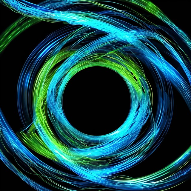 抽象蓝绿光线编织图案,圆形孤立在黑色背景上。矢量插图。技术、科学、音乐传单、数字横幅的现代设计模板
