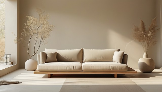 简约现代的室内环境,温暖的米色调,舒适的沙发和自然元素。