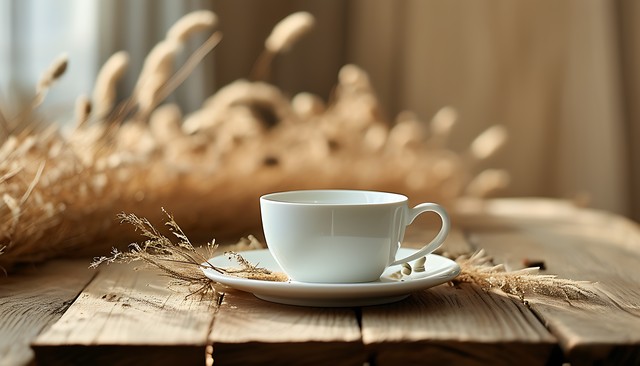 一杯白色咖啡杯放置在木桌上的宁静背景,旁边有一些干草和自然元素,散发出温暖的氛围。