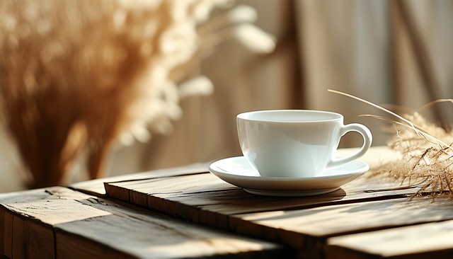 一杯白色咖啡杯放置在木桌上的宁静背景,旁边有一些干草和自然元素,散发出温暖的氛围。