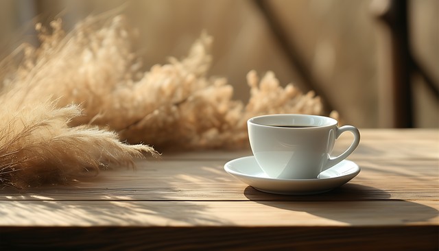 一杯白色咖啡杯放置在木桌上的宁静背景,旁边有一些干草和自然元素,散发出温暖的氛围。