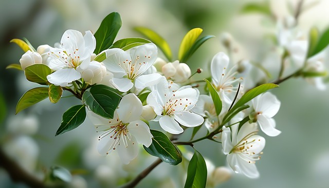 盛开的白色花朵与绿色叶子的自然美景,感受大自然的魅力。