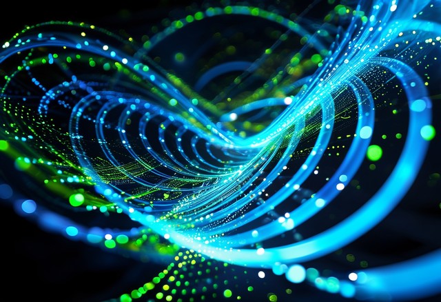 抽象圆点线条图案旋转蓝色绿光孤立在黑色背景中的音乐、技术、数字概念