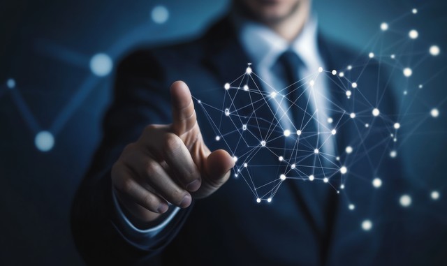 商人触摸电脑屏幕上的数字按钮,拥抱技术和互联网连接的未来。虚拟世界中的商业和媒体交互概念。
