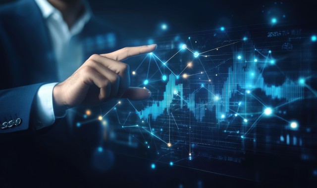 商人的手触摸数字屏幕,与全球网络和技术概念互动。通过抽象地图和媒体界面可视化世界连通性。