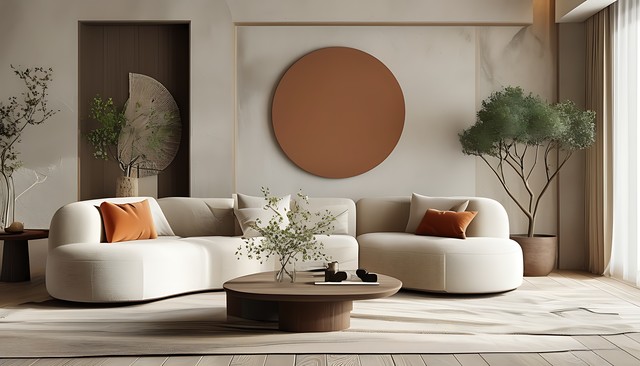 时尚舒适的客厅设计,现代装饰元素融合自然质感。